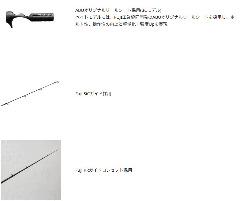 ベイトモデルには、FUJI工業協同開発のABUオリジナルリールシートを採用し、ホールド性、操作性の向上と軽量化・強度Upを実現