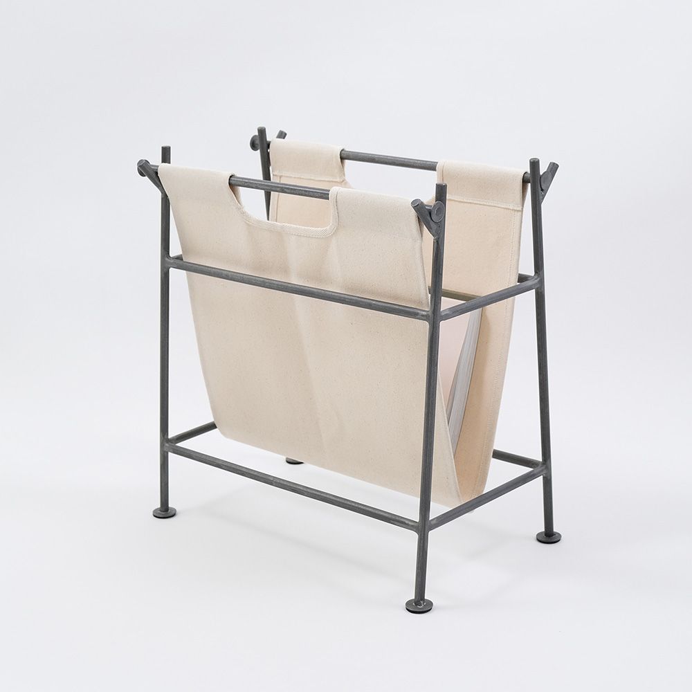 生成りカラーのキャンバスとアイアンの組み合わせが木製家具との相性の良いマガジンラック。キャンバス部分は取り外して洗うことができて、使わない時はコンパクトに保管することもできる細部までこだわった一点です。生活感が出てしまう本や新聞紙をサッと片付けられ、洗練された印象の上質なインテリア空間に。ソファ横に置いてブランケット入れ、タブレット収納、来客時の手荷物やバッグの置き場所にしたりと物入れとして幅広く使っていただけます。アイアン部分は職人の手作業で溶接、曲げ加工を施しており、素材の色合いをそのまま生かした素地仕上げを採用しています。マットな質感なのでインテリアにもよく馴染みます。
