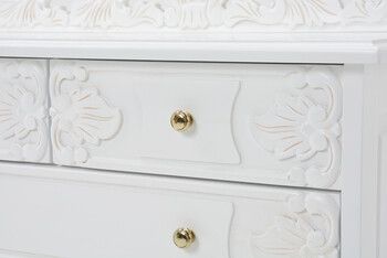 エレガントな彫刻と特徴的な猫脚、古くから使い込んだような味わいのアンティーク調ワイドチェスト。