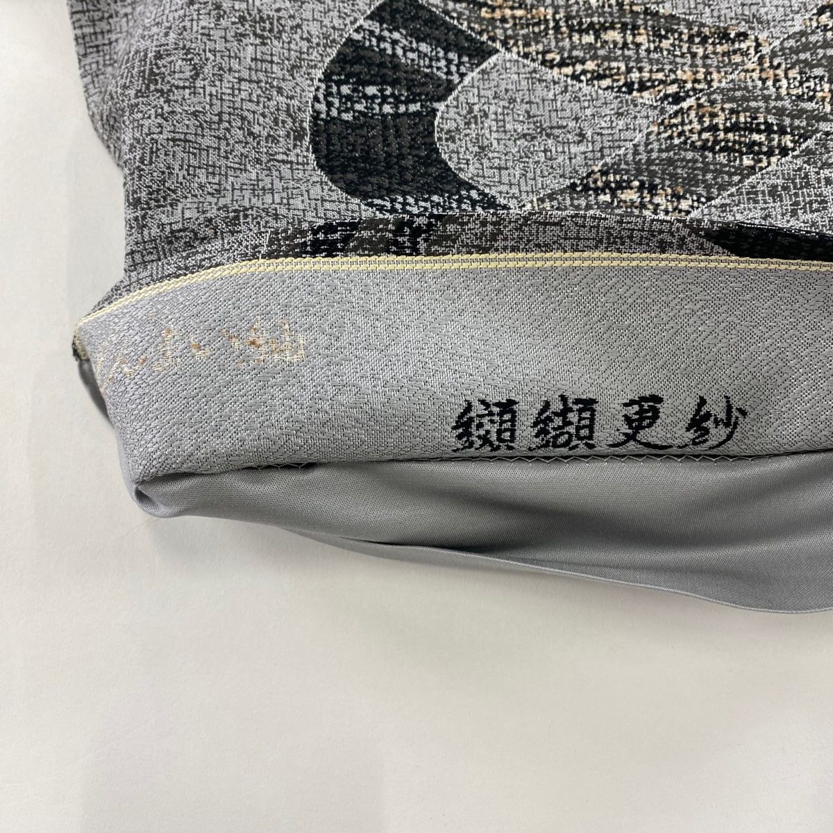 袋帯 ぜんまい紬 幾何学 纐纈更紗 黒灰 六通 正絹