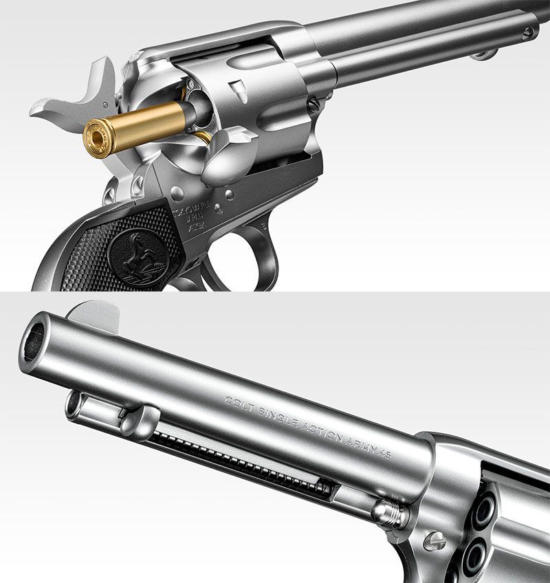1発ごとに手動で発射準備を行なう、手軽なエアーコッキングモデルです。ハンマーを操作するだけで発射準備完了となり、あとはトリガーを引くだけでBB弾を発射します。BB弾をセットしたカートリッジを、ハーフコック状態で1発ずつシリンダーにセット。本モデルならではのリロードが楽しめます。また、カートリッジはエジェクターロッドで1発ずつ取り出すことが可能です。