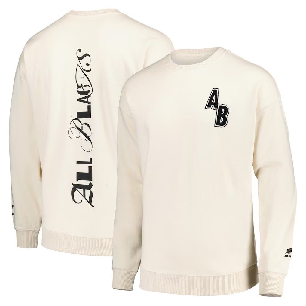 リラックスフィットで、胸に「AB」のレタリング、背中にミックスフォントの「All Blacks」テキストが入っています。
