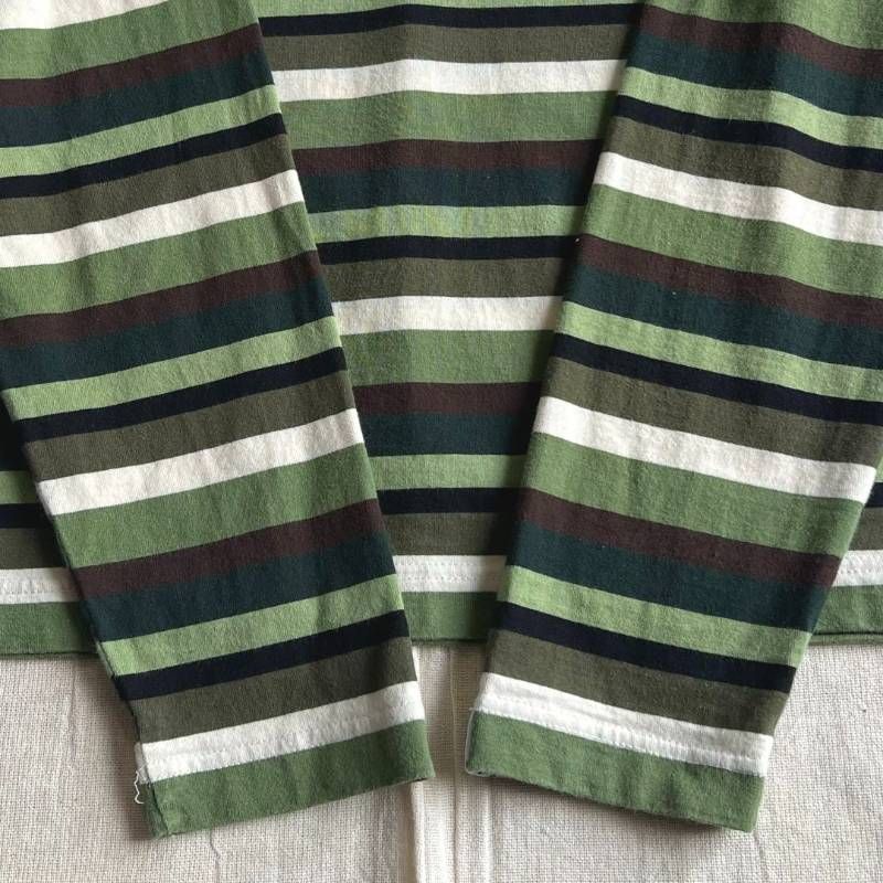 濃淡グリーン・カーキ・ブラウン・ブラック・ライトベージュ系のくすみカラーでデザインされた細いマルチボーダーが個性的な総柄のロングスリーブ(長袖)Tシャツ・カットソーです。