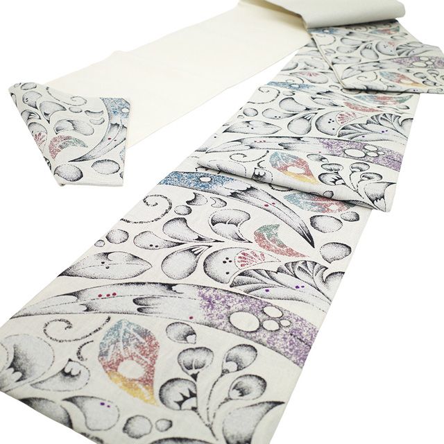 袋帯 正絹 京都 西陣 有栖川織物 銀糸 ライトグレー 辻が花 おしゃれ パールトーン加工済み 春 秋 冬 上 絹芯仕立て 仕立て上がり みやがわ sb 54681