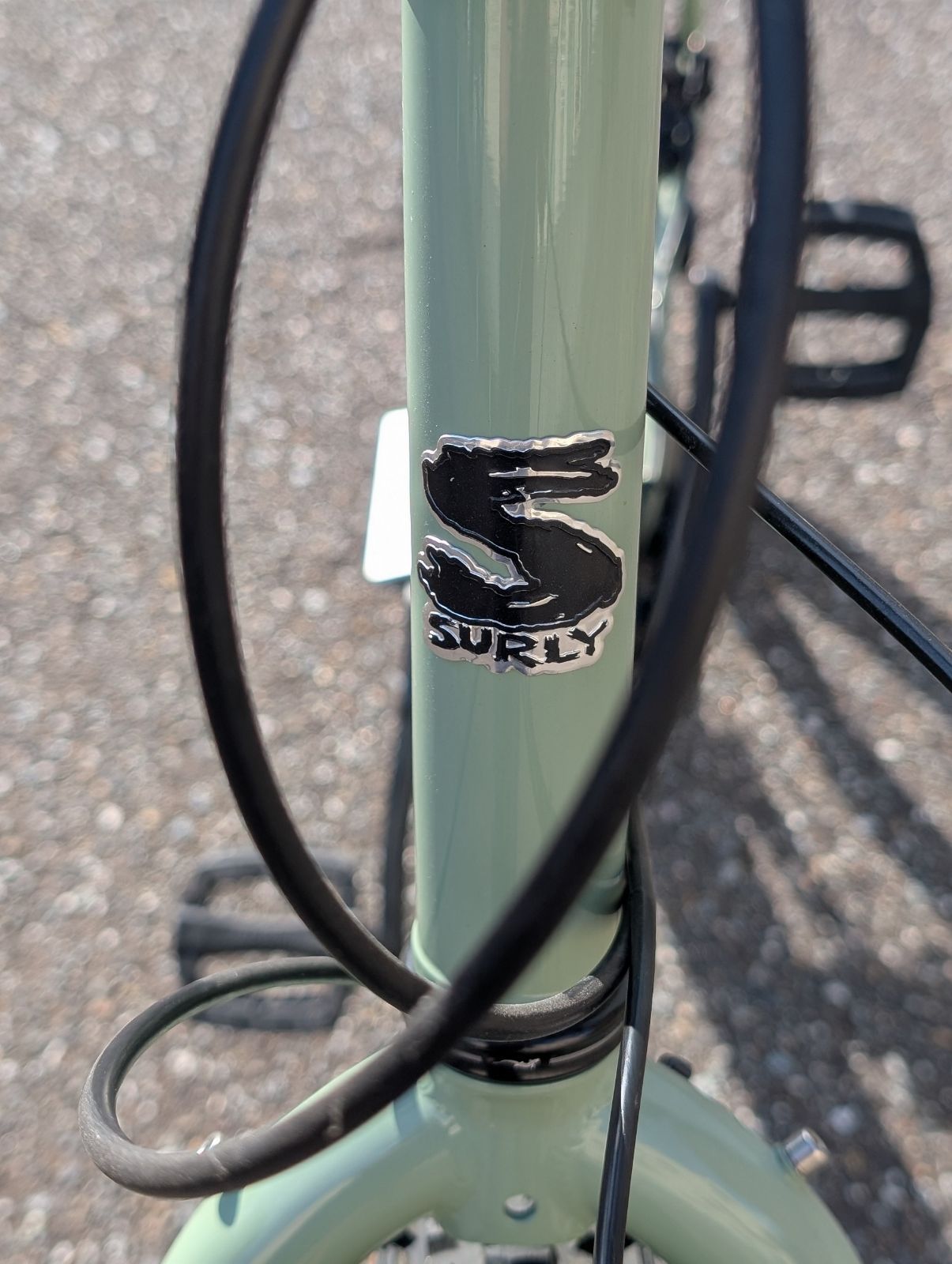 100%サーリーのクロモリ鋼フレームとフォーク、サーリー独自の「ナッチチュービング」、ダブルバテッドメイントライアングル、1-1/8インチヘッドチューブ、ノンサスペンション補正済み。