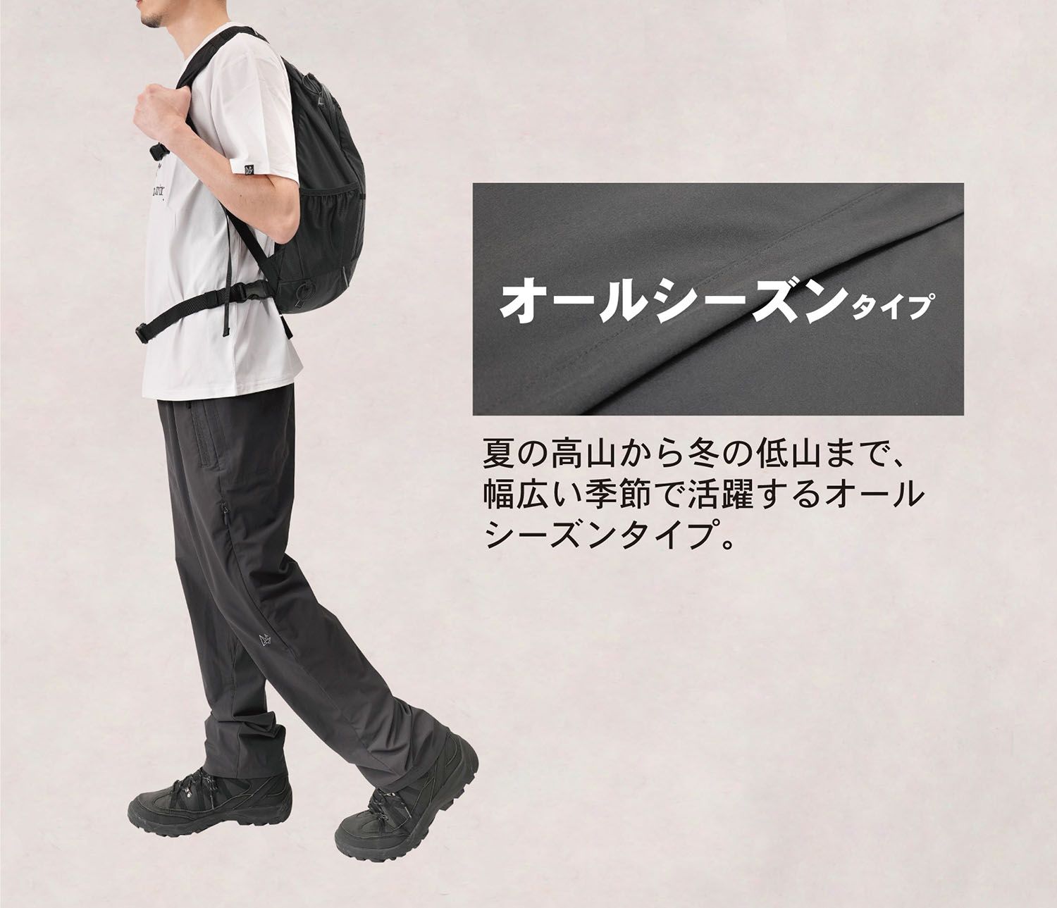 アウトドア、登山はもちろんのこと、街着としても活用できる汎用性が高いパンツ。幅広く活躍する中厚地のオールシーズンタイプ。