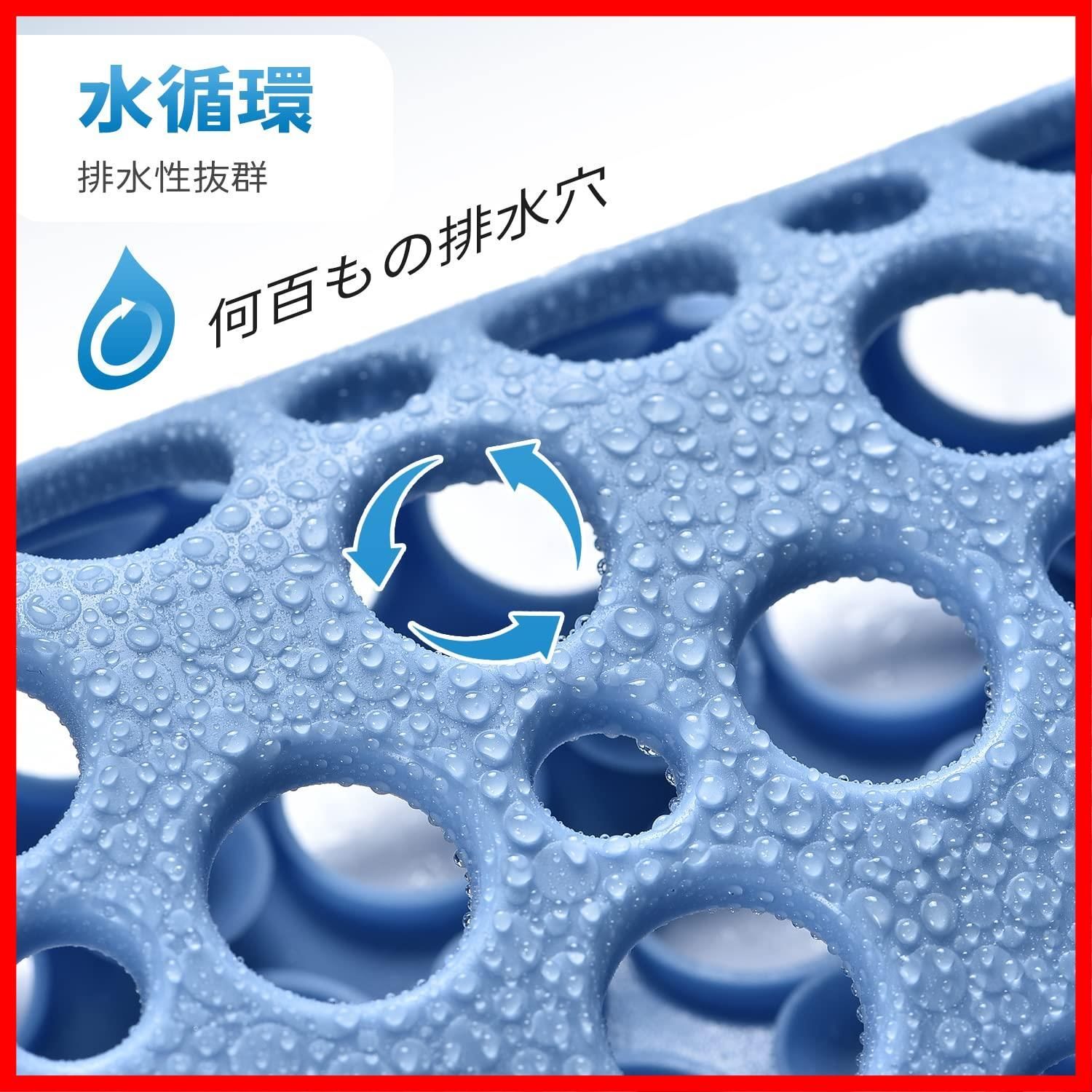 【排水性抜群】お風呂マット表面何百もの排水穴に水分が残らないよう排水穴から素早く排水し、乾いて清潔に保ちます。水が循環できる様に穴が開いてるのが特徴です。使用前に1度洗濯するのがおすすめです。