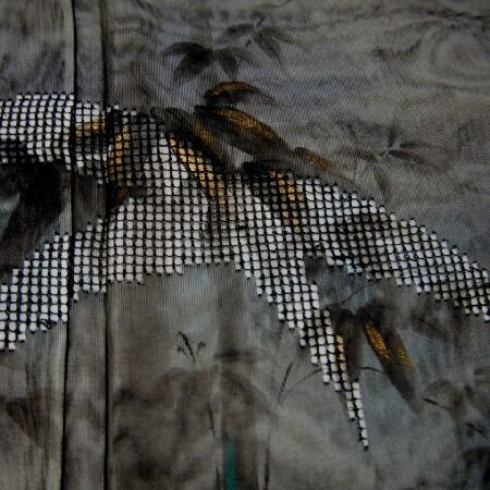さらりとしたオフホワイトの紗地に笹竹模様を染め施し、黒の紗地と縫い合わせました紗合わせの夏訪問着。