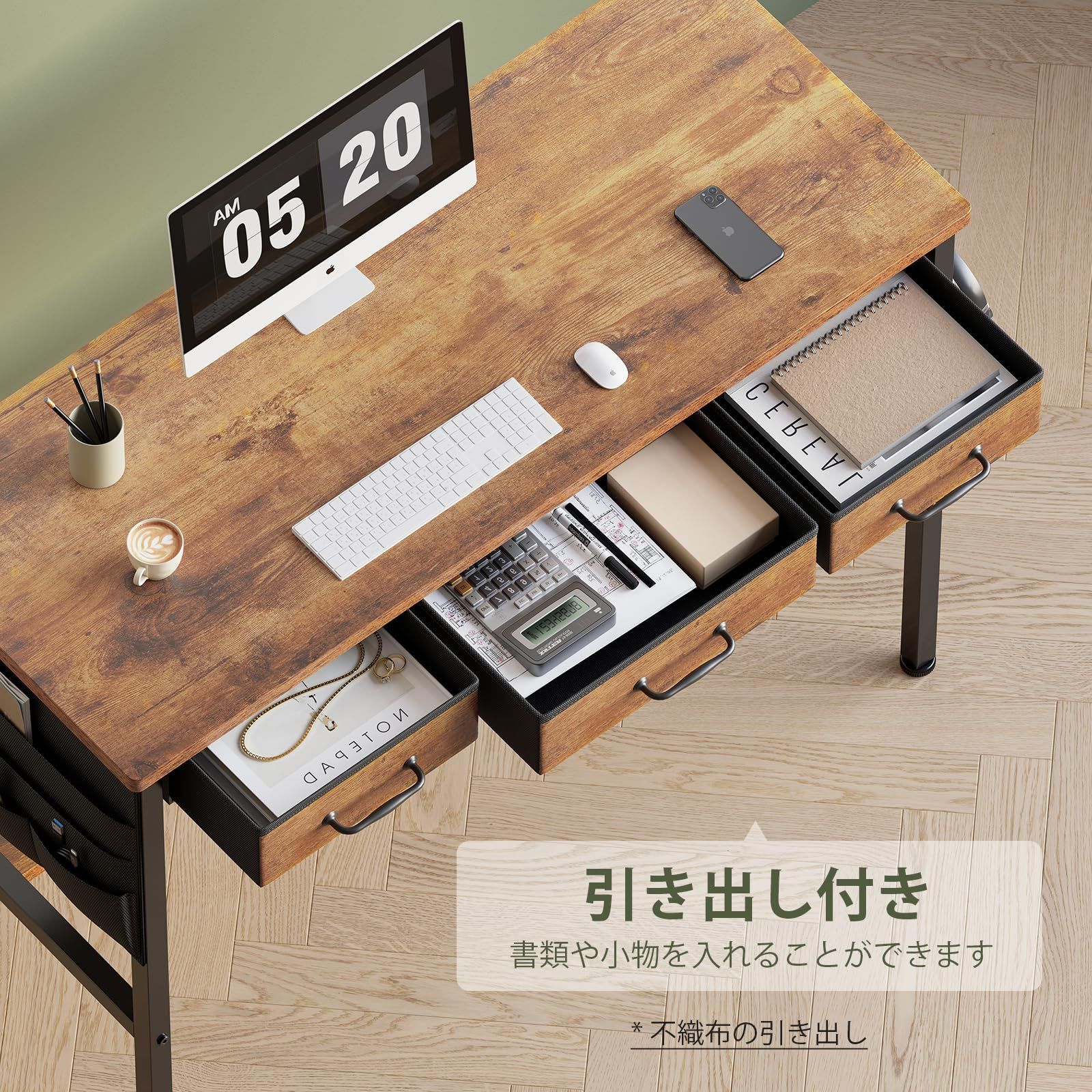 Maihail デスク 机 pcデスク 幅100 40 cm パソコンデスク 引き出し付き 下収納棚付き 収納袋付き ピンテージ2