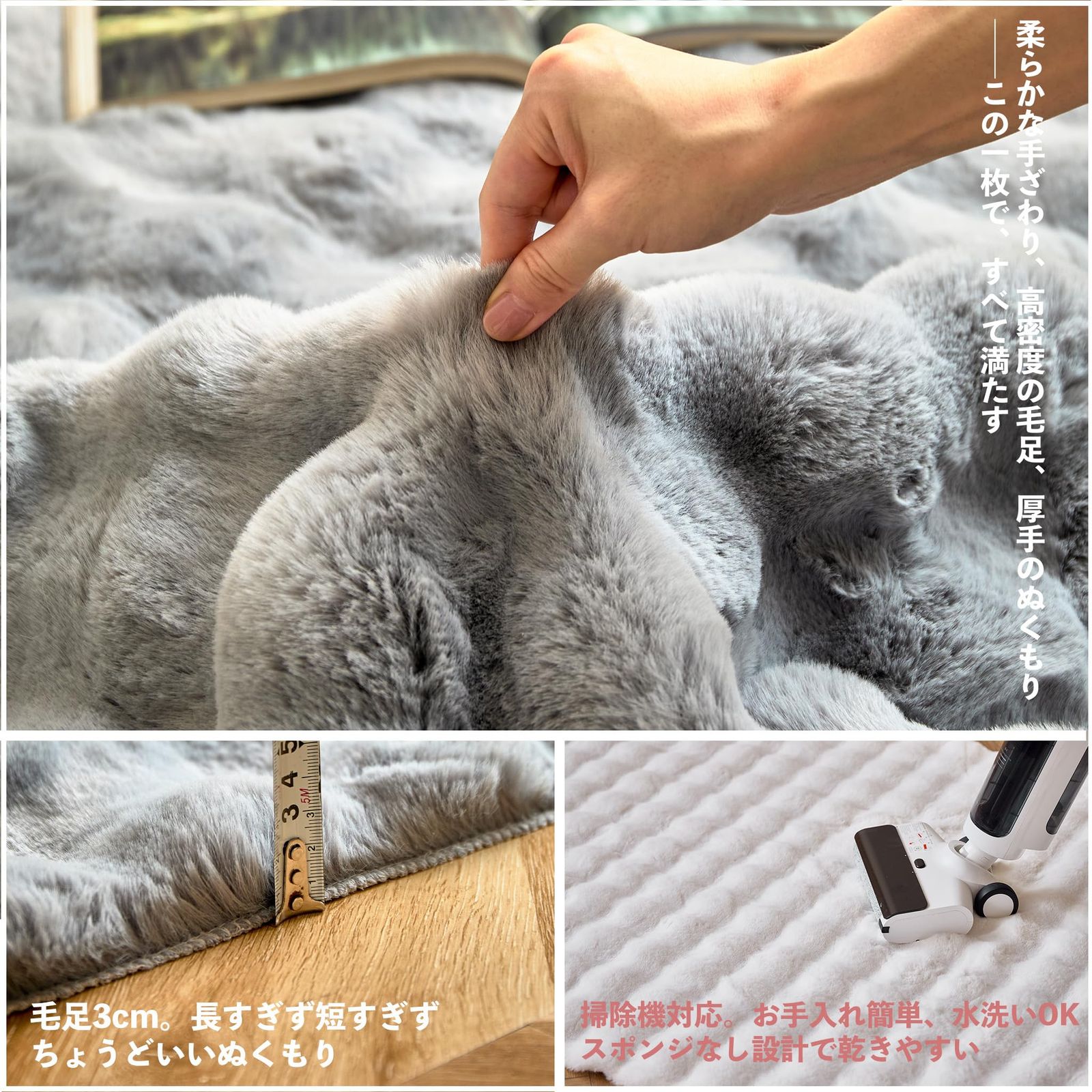 このもこもこでかわいいフェイクラビットファーのラグは、ポリエステル製のロングパイルで、ポコポコとした3d立体感が特徴です。韓国インテリア風のデザインで、リビング、子供部屋、ベッドルームなど様々な空間にマッチします。長方形の形状で、2畳や3畳サイズに対応しており、フローリングにも最適です。裏面はスエード調で滑り止めシリコンドット加工されており、安心してお使いいただけます。ホワイトやベージュの優しいカラーで、お部屋の雰囲気を明るくします。ペットやエアコンのあるお部屋にもぴったりで、ラグマット、デスクマット、クッションマット、防音マットなど、様々な用途でご利用いただけます。ベッドマットやジョイントマット(厚手)、アウトドアマット、玄関マット、キッチンマットなどとの組み合わせもおすすめです。このラグは、カーペットや絨毯、ラグマット(2畳・3畳)、デスクマット(床用)、カッターマット、アイロンマットなど、多様なニーズにお応えします。carpet living roomやペットカーペット、1畳カーペット、2畳カーペットなど、様々なサイズや用途でご利用いただけます。