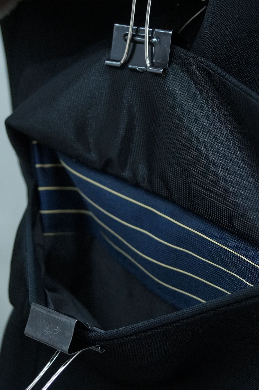 ・裏地、ポケット、袖 紺色のストライプ