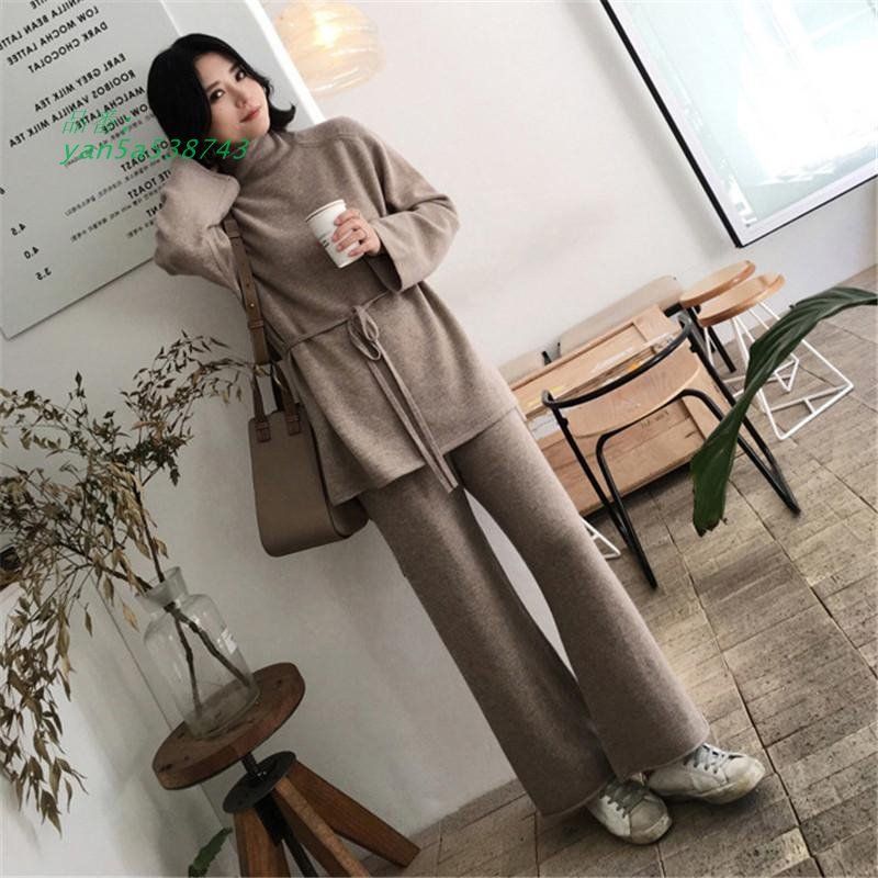 セットアップ レディース ニット 秋冬 セーター ワイドパンツ カジュアル ゆったり 長袖 チノパン ハイネック 上下セット yan 5 a 538743
