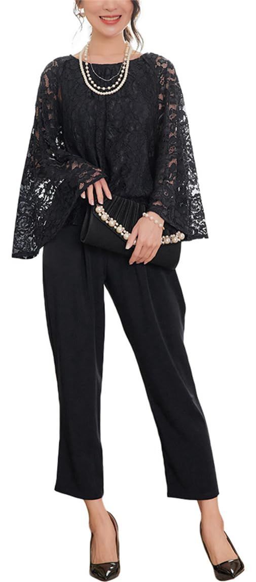 Color ブラック_Size M ZHENGTU レディース パンツスーツ セットアップ レースブラウス ケープ風 パンツドレス テーパードパンツ パーティードレス 結婚式 披露宴 お呼ばれ ブラック