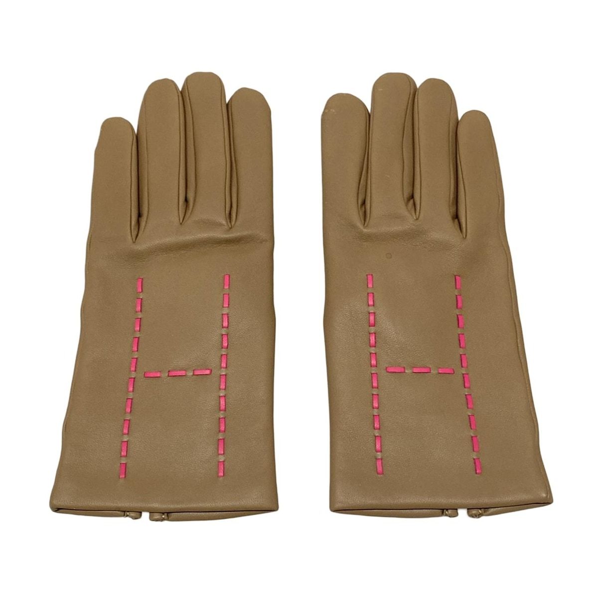 HERMES エルメス 手袋 7.5 レディース ダークブラウン×ピンク イニシャル刻印 カシミヤ ラムスキン
