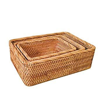 AMOLOLO ハンドメイド 長方形 ウィッカー フルーツボックス ラタントレイ マガジンオーガナイザー 小さな物容器 サービングバスケット 3-Size Ki