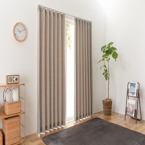 ネイビーとベージュの2配色展開。ネイビーは2級遮光、ベージュは3級遮光の遮光機能が付いたドレープカーテンです。生地はしっかりとした厚みがあります。お部屋が暗くなりすぎず光を程よく取り込めます。ウェーブを綺麗に保つ“形状記憶加工”を施しており、洗濯しても型崩れしません。同色のタッセルとアジャスターフック(Aフック)が付属されております。