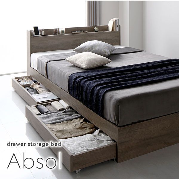 ベッド 収納ベッド シングル ボンネルコイルマットレス付き グレージュ 収納付き 引き出し付き 棚付き 宮付き 2口 コンセント付き 頑丈構造 木製 オーク柄 シングルベッド