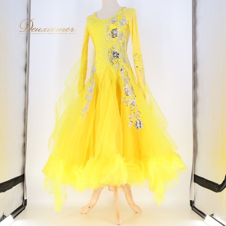 社交ダンス 衣装 ドレス ワンピース 黄色 フロート レース フリル スパンコール シルバー イエロー系 デモ 競技 ダンス パーティ 鮮やか エレガント おしゃれ パフォーマンス 大人用 競技用 フロア レディース