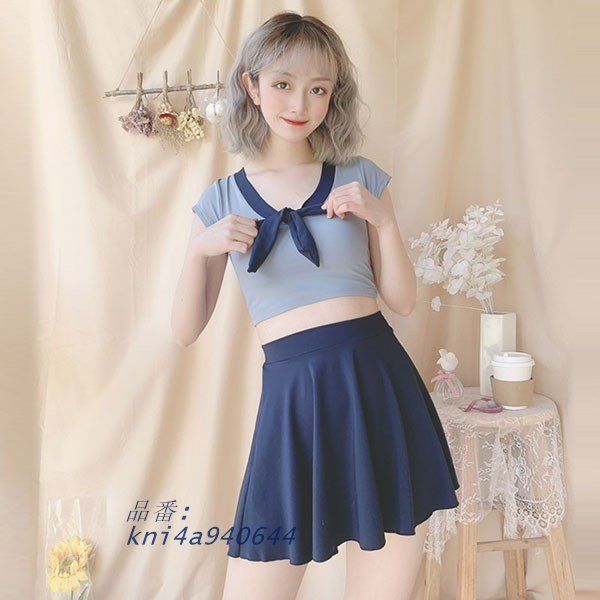 水着 上下セット レディース マリン風 かわいい リボン 学生水着 L 着 せ ビーチブルー 温泉 ネイビー M プール 撮影 kni 4 a 940644