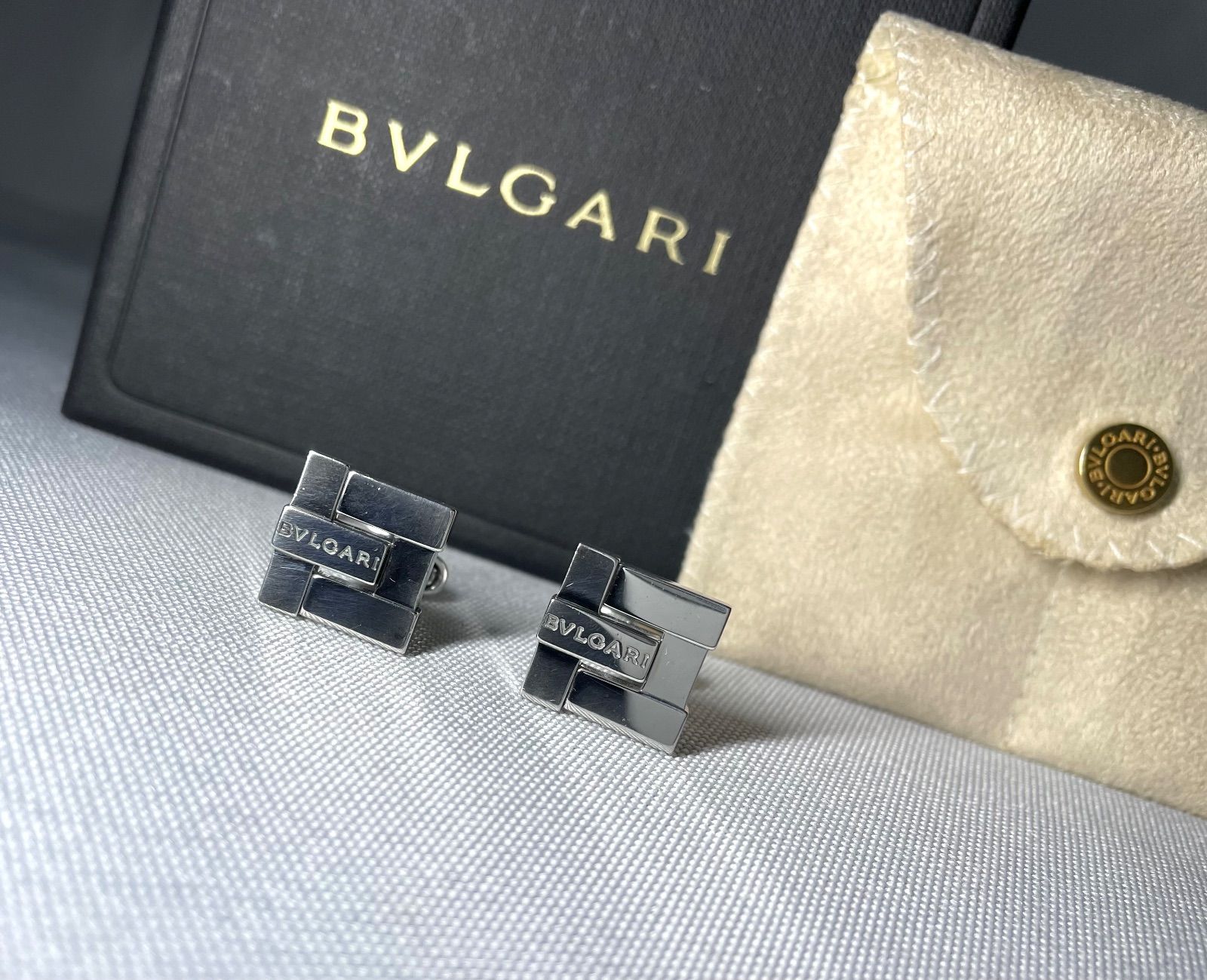 BVLGARI ブルガリ ブランドロゴ文字 鏡面スターリングシルバー スクエアカフス カフリンクス ボタン SV 925 あり