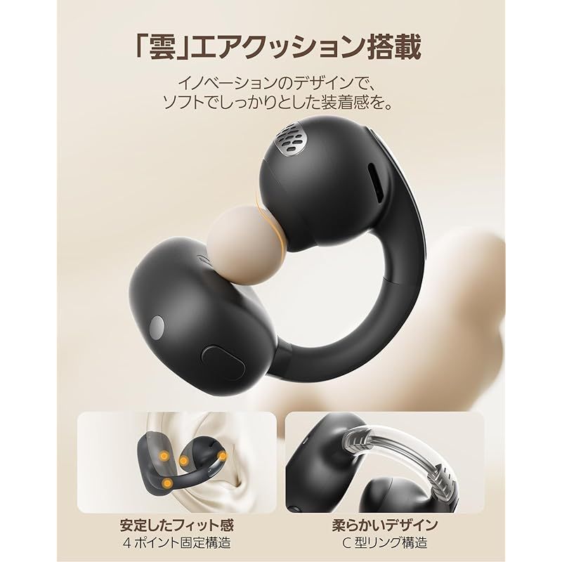 【雲のような装着感、しっかりフィットで落ちない安心感】 Baseus MC1は、イヤーカフ型のオープンイヤーイヤホンとして、耳にやさしくフィットする独自の「雲」エアクッションを採用、クラウドのように柔らかな着け心地を実現しながら耳にしっかりとフィットします。耳をふさがない開放型ワイヤレスイヤホンとして、快適さと安定感を両立。わずか5.2gの軽量デザインで、長時間の音楽を聴いてもストレスフリーで圧迫感を最小限に抑え、付けていることを忘れそうになったフィット感です。4点固定構造により、運動中でもしっかりと装着できます。