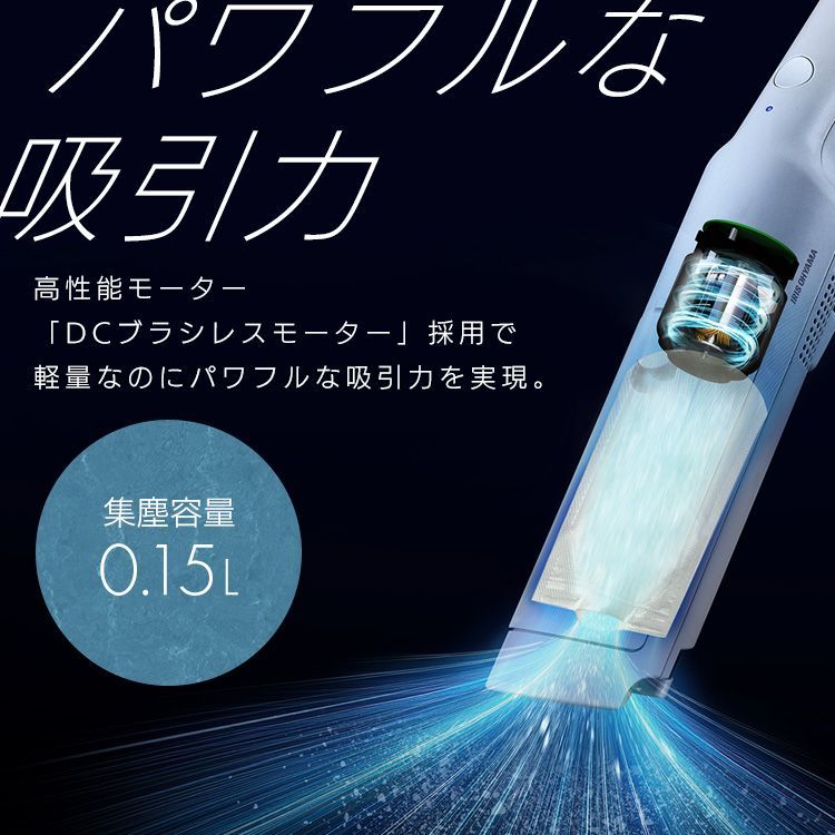 高性能モーター「DCブラシレスモーター」採用で、軽量なのにパワフルな吸引力を実現。