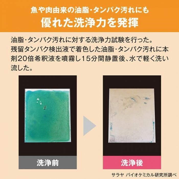 界面活性剤と次亜塩素酸ナトリウムの相乗効果で複合汚れに効果を発揮。洗浄と除菌が一度にできて便利です。水産の加工場、食肉の加工場に最適です。発泡洗浄に最適な泡が加工機械の細部まで行き渡り、洗浄効果をさらに発揮します。洗浄力・除菌力が非常に高く、汚れに応じて使用量を削減できるので経済的です。洗浄成分が水に溶けやすく、素早くすすげて作業負担を軽減。専用ボトルに詰め替えてのご使用が便利です。