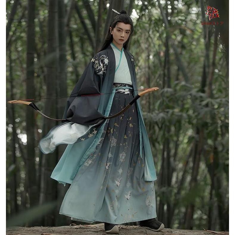 高品質 中華コスプレ衣装 羽織付き3点セット メンズ チャイナ服 漢服 暗色系 グラデーション 中華服 交差襟 花 タンチョウ 鶴 刺繍 プリント 大人