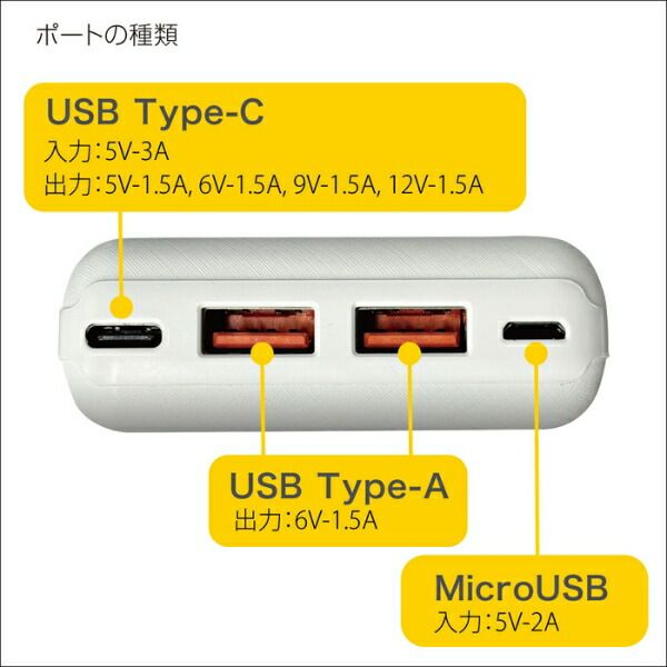 ■出力ポート:USB-A:6V-1.5A(2ヶ所) Type-C:5V-1.5A, 6V-1.5A, 9V-1.5A, 12V-1.5A (最大18W)(1ヶ所)