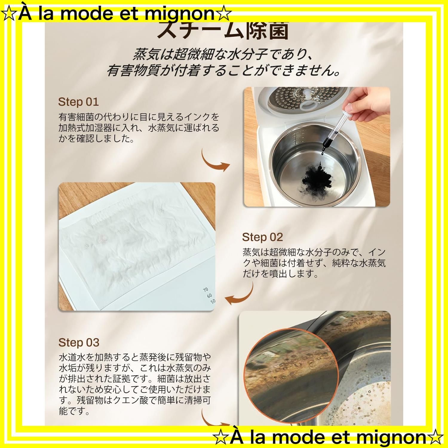 【清潔で健康的な暖かい霧】クリーンな蒸気でお宅の空気品質を改善しましょう!従来の超音波加湿器と比べ、この革新的な加熱式加湿器は水を 100 度まで沸騰させ、清潔な温かいミストを放出します。寝室、育児室、子供部屋、リビング、オフィスでの使用に非常に適しています。乾燥、アレルギー、鼻づまりを和らげるのに役立ち、より衛生で健康的な快適なミストをお楽しみいただけます。特に乾燥しがちな冬場やアレルギーの多発シーズンに最適です。