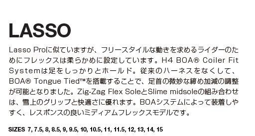 Lasso-Proに似ていますが、フリースタイルな動きを求めるライダーのためにフレックスは柔らかめに設定しています。