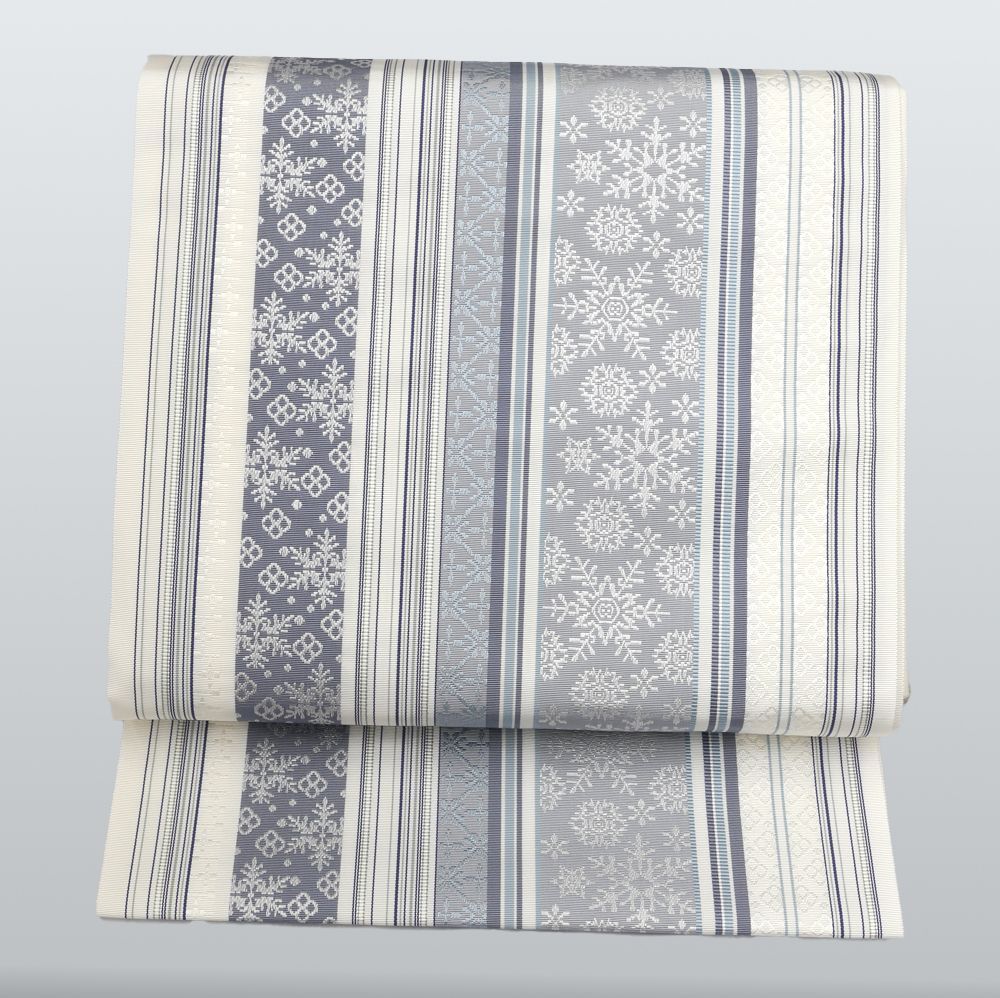 未仕立 博多帯 黒木織物 八寸名古屋帯 雪の結晶柄 白地グレー 仕立代込み