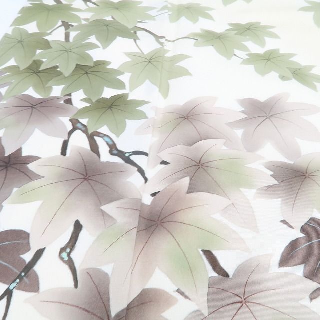 こちらのお着物は、浅黄色の染めに手描き友禅で楓の姿を込めた一枚。