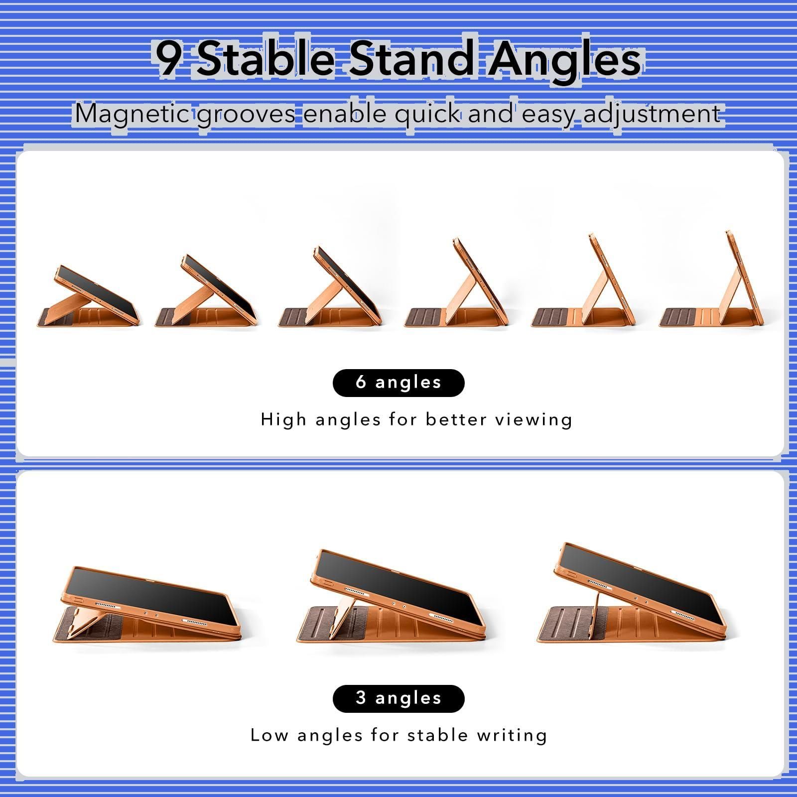 【高い汎用性】:デュアルサポートブラケットと6つの磁性の溝により、最大9つの異なる角度(視聴用6つ、手書き用3つ)で使用できます。また、カバーは簡単に取り外すことができ、ハンズフリーでゲームをしたり、冷蔵庫に磁気吸着できます