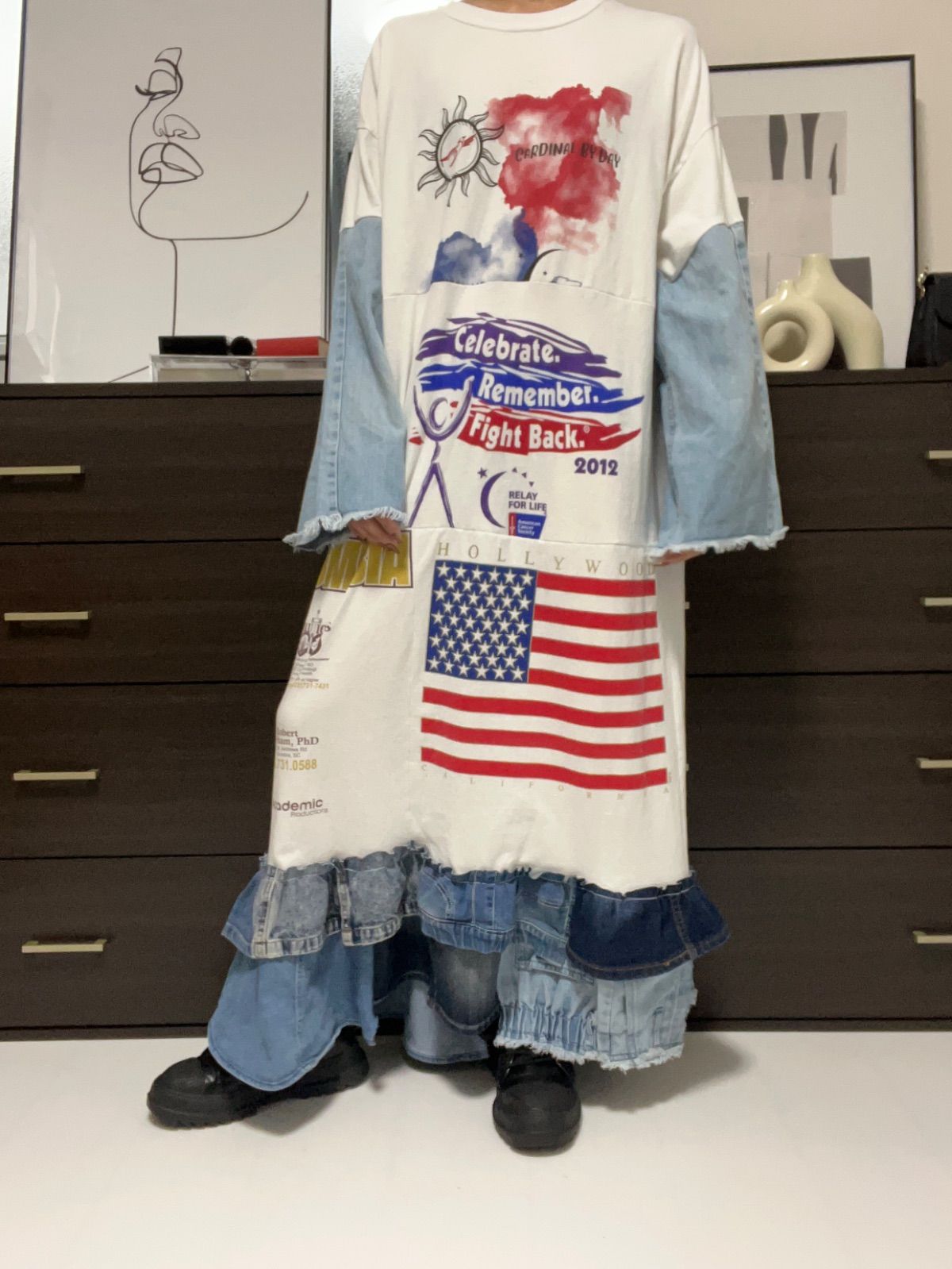 リメイク古着 remakeードッキングワンピース 長袖ロングワンピース ロゴT 白 デニム フリル
