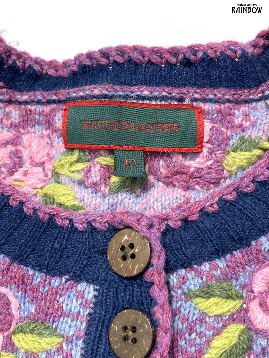 #ニット #カーディガン #ロングスリーブ #青 #紫 #花柄 #ラムウール #柄カーディガン