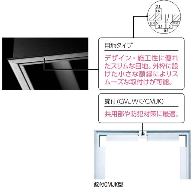 外枠に設けた小さな額縁によりスムーズな取付が可能 ●スライドアーム開閉機構:開口が広く スムーズに開閉します