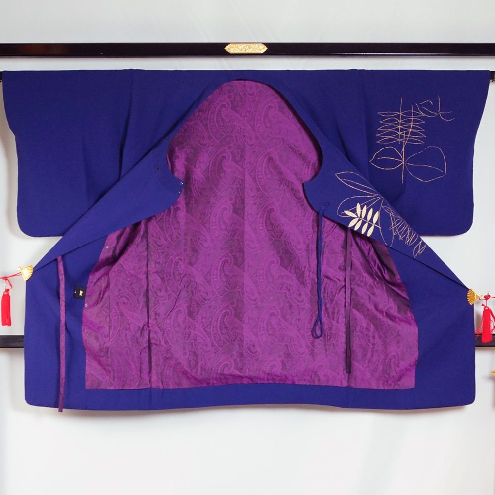 紅桔梗色系のちりめん地に本金箔の枝葉模様が施された道中着です。