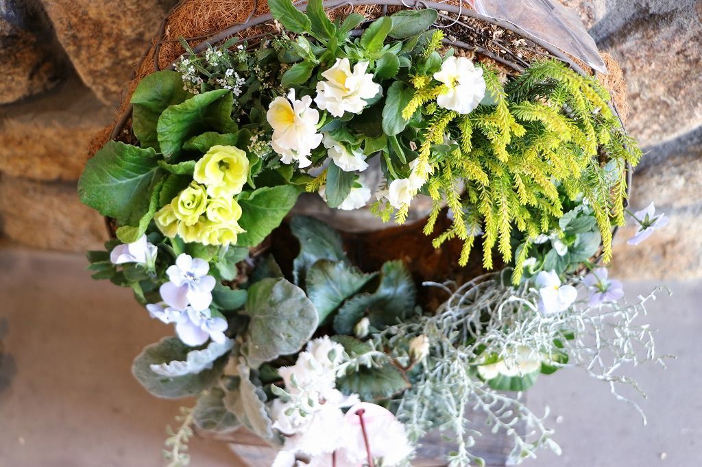 季節の花苗を使い、可愛いリースの寄せ植えにしました♪