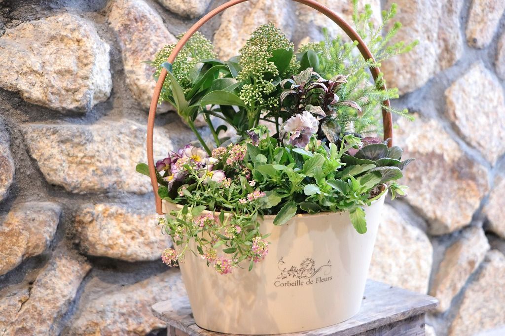 季節の花苗を使い、可愛いパステルカラーの持ち手付き植木鉢に寄せ植えしました♪