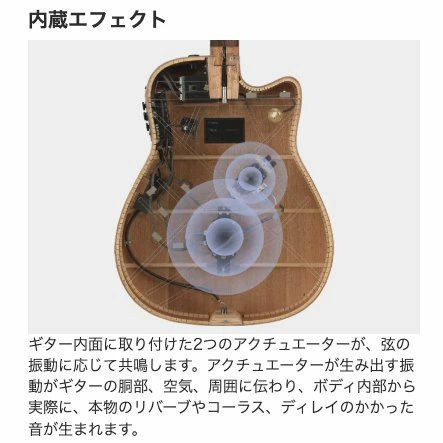 弦の振動を電気信号に変換してエフェクト処理し、ボディの内部に設置した「アクチュエーター(加振器)」に伝え、アクチュエーターがギター全体を振動させる構造を採用しています。