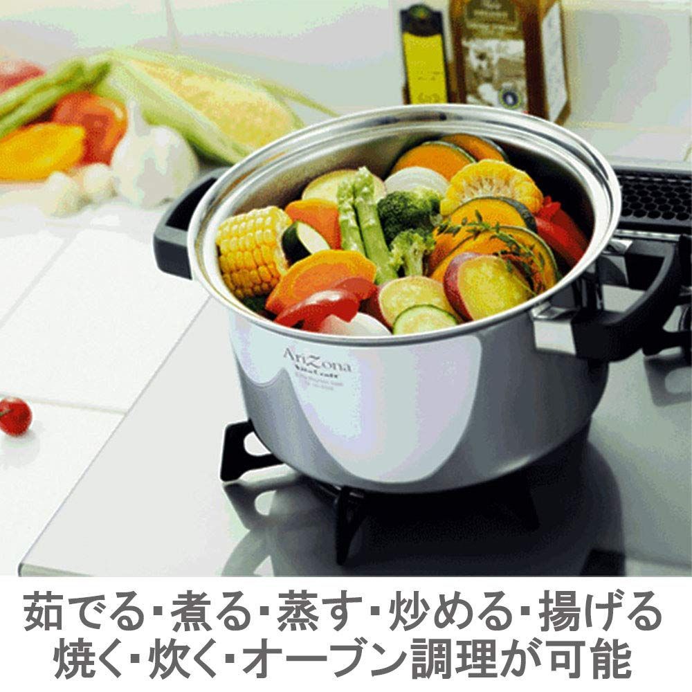 ステンレス多層構造鍋のアリゾナ無水調理で野菜の栄養がたっぷり。全面5層構造の優れた熱伝導で調理時間を大幅にダウン。全面5層構造の優れた保温力で余熱調理も可能鍋の中でかまど炊きに近い対流がおき、ごはんを素早くふっくら炊き上げる より ●無水・無油調理で美味しくヘルシーに素材の味をぐっと凝縮する
