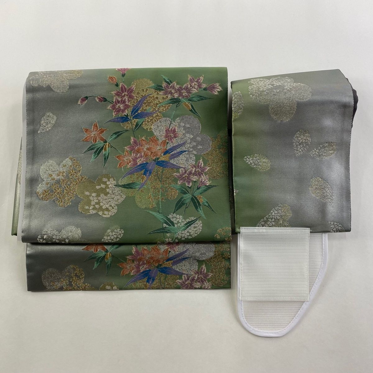 付け帯 秀品 作り帯 やまと 草花 桜 刺繍 金銀糸 灰緑 正絹