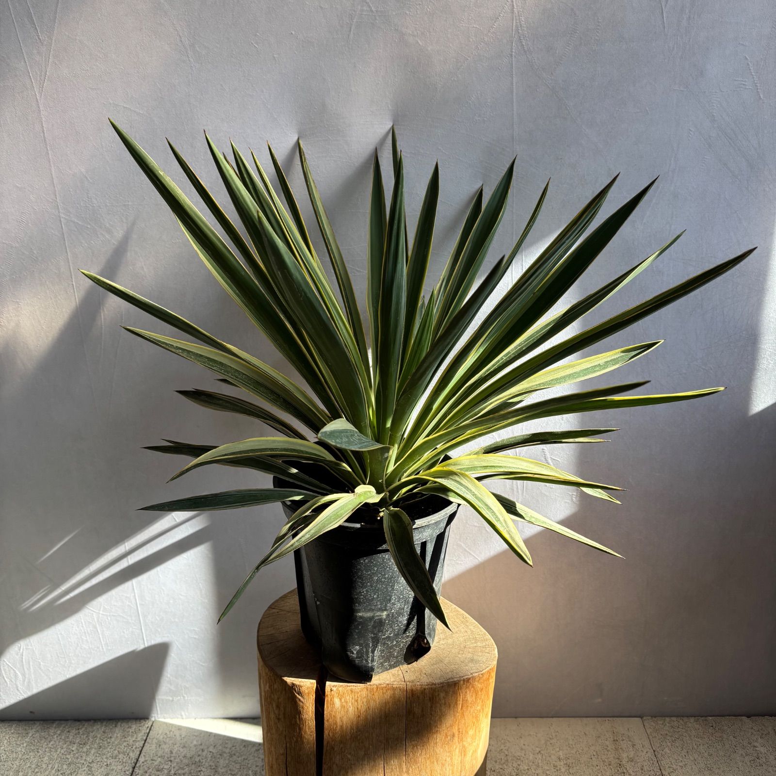 ユッカ グロリオサの斑入り品種です。美しいクリーム色の斑が特徴で、耐寒性、耐暑性、耐乾性があり、非常に丈夫で育てやすい植物です。