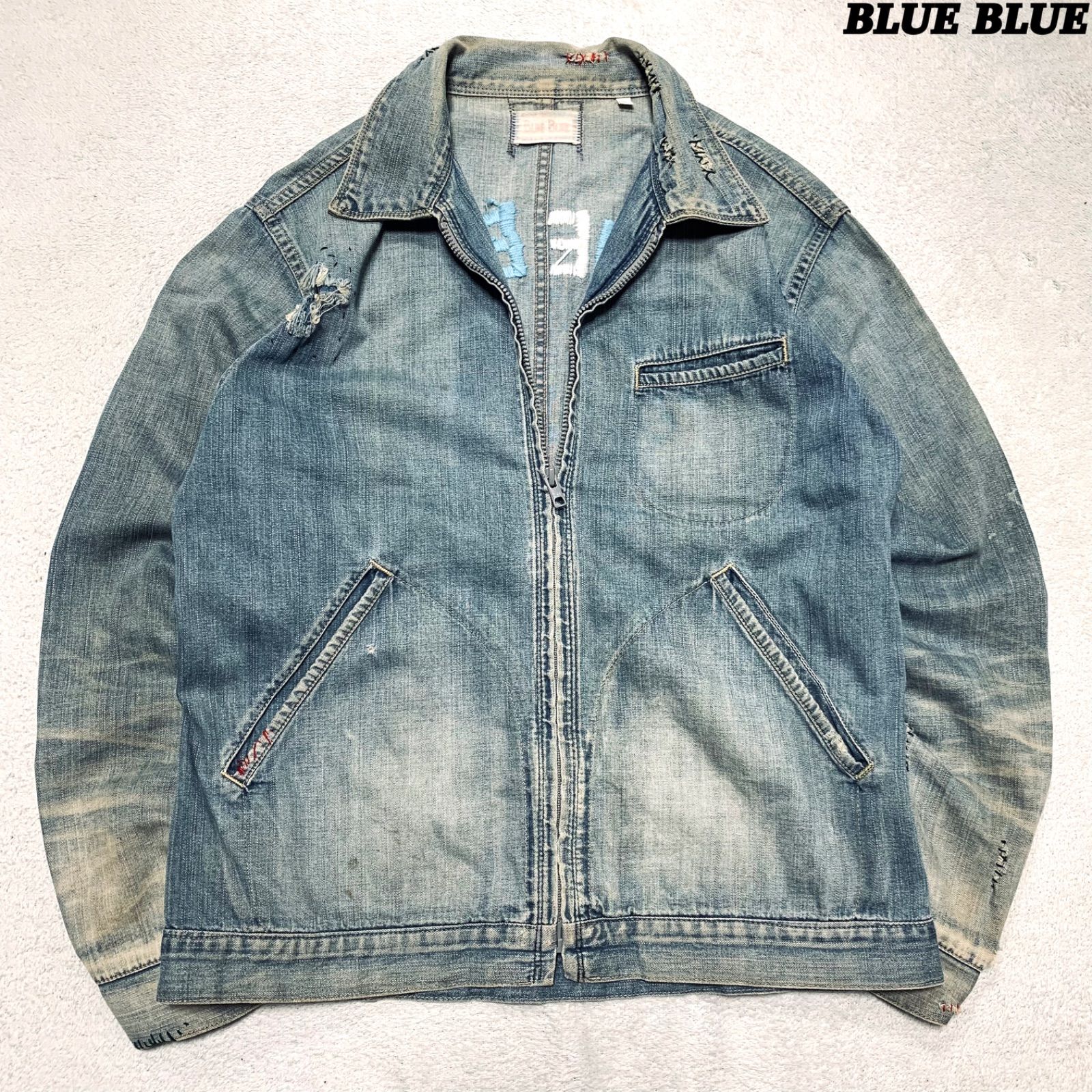 BLUE デニムジャケット ワークジャケット ドリズラージャケット ハリントンジャケット スイングトップ ヴィンテージ加工 ダメージ加工 フェード リペア ロゴ刺繍 サイズ2 インディゴブルー アイスブルー 青系 ブルーブルー