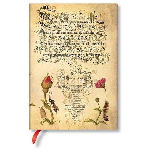 "オランダの静物画が発展を遂げる前、彩飾家たちは手書きの原稿に動植物を描くことで、感情に訴えかける力を作品に与えました。このスタイルで知られているのがヨーリス・フーフナーへルです。1590年代、神聖ローマ皇帝のルドルフ2世は、""MiraCalligraphiaeMonumenta(ミラ・カリグラフィ見本帳)""に彩飾を施すようにフーフナーヘルに命じました。この見本帳はゲオルグ・ボチカイが16世紀中期に書いたもので、本デザインではその1ページを再現しています。【検索ハッシュタグ】#紀寺商事#pb#ペーパブランクス#輸入ノート"