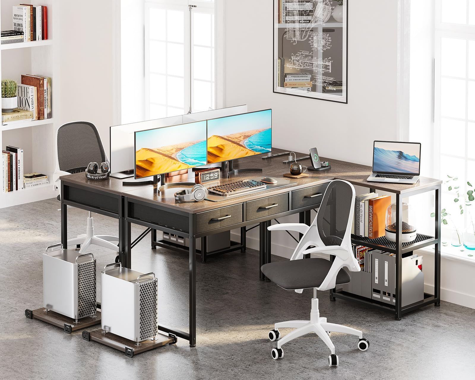 【引き出し3杯付きl字デスク・収納力満載】デスクの下には一体型の引き出しとラックが備え、本や書類などを使いたい時にサッと取り出せます。たっぷりの収納でデスク周りをスッキリ快適に!また、L字型のデザインで部屋のコーナーを最大限に活用でき、ご家庭でもオフィスでも、日常の仕事に十分なスペースを確保できます。