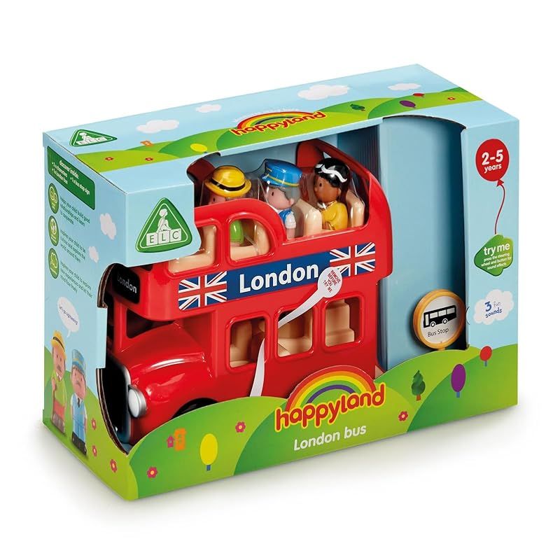 ELC社のハッピーランド ロンドンバス(Happyland London Bus)は、キュートなデザインの真っ赤な2階建てバスに3人のキャラクター、バス停標識がセットになった2歳から遊べる知育玩具です。