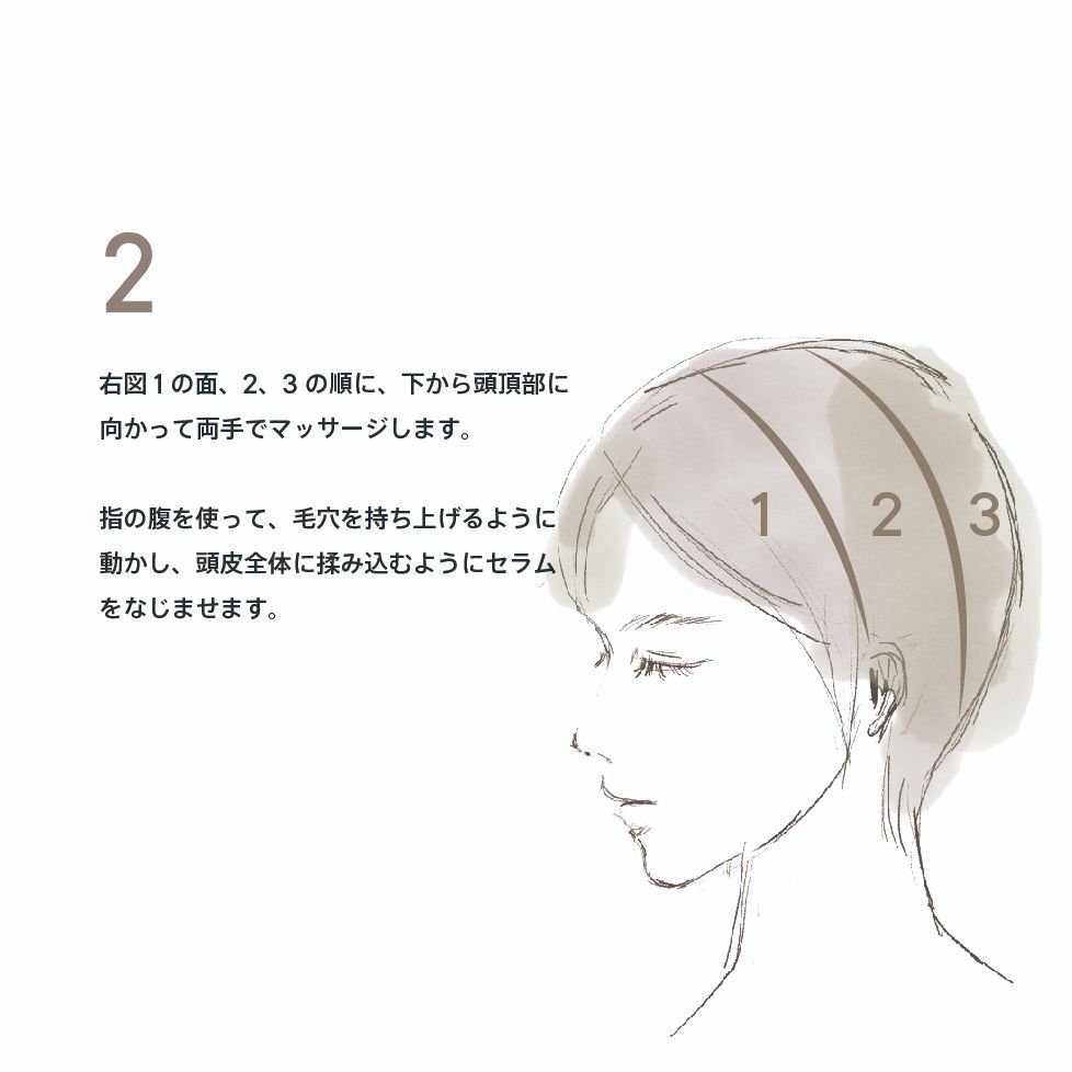 ニームリーフエキスと亜麻配合のセラムを頭皮全体になじませてマッサージすることで、頭皮をやわらかく健やかにキープして、ハリ・コシのあるしなやかな髪を育みます。