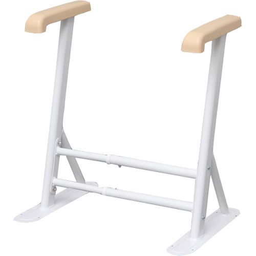 足腰にかかる負担を軽くするトイレ用サポート手すりです。工事不要でトイレに簡単に設置ができます。接地面にEVA樹脂を使用することで、床に固定しなくても滑りづらく、安心してお使いいただけます。左右の幅が5段階伸縮可能でトイレや使用者に合わせて幅を調節できます。手すり部分は安心の抗菌加工です。
